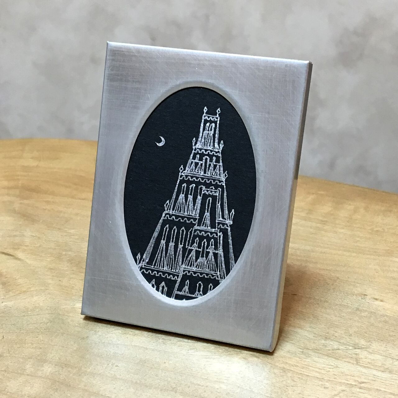 黒い紙にシルバーのペンで描いた原画を、アルミ製の小さな額縁に入れました。(ガラスは外して撮影しています)