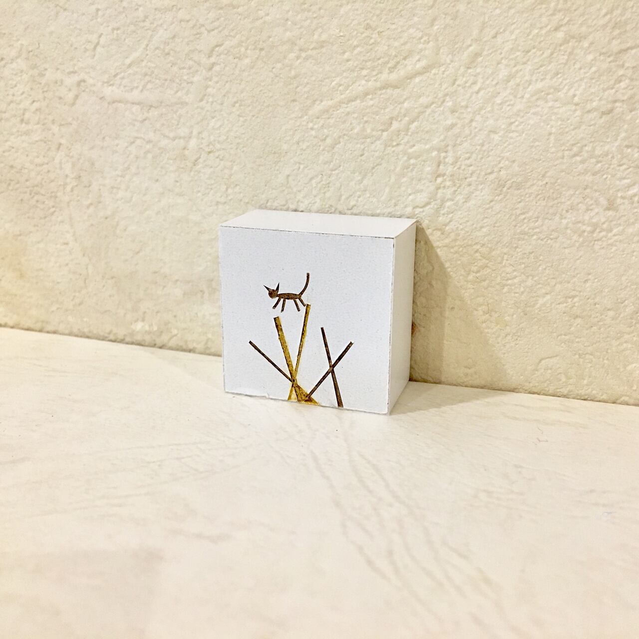 キューブ型の化粧板をデザインナイフでカットした小さな切り絵作品。アクリル絵の具のゴールドで一部を着色して仕上げました。Sサイズ(3×3cm)1点です。