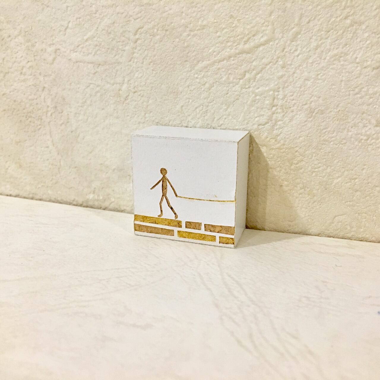 キューブ型の化粧板をデザインナイフでカットした小さな切り絵作品。アクリル絵の具のゴールドで一部を着色して仕上げました。Sサイズ(3×3cm)1点です。